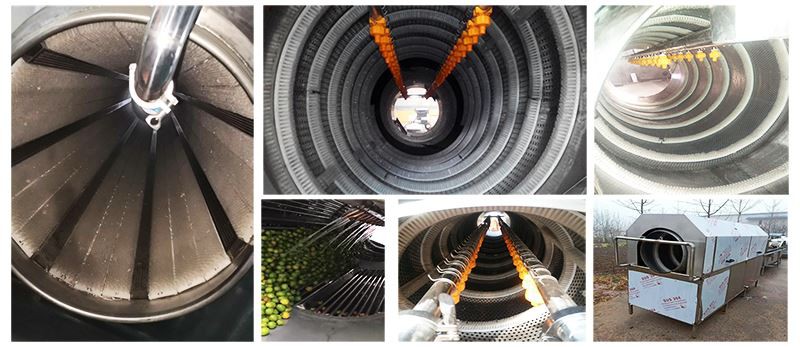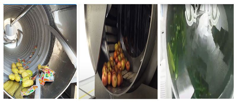 After the materials enter into the roller, under the running of spiral blade, the materials roll over and move forward.The high-pressure spray device inject water column with air bubbles with high speed.When contacted with the material,the bubble rupture and generate energy to wash the materials and also push the materials to the brush roller. The brush roller can remove any impurities thoroughly such as hair. Then the materials go into the rotor cage and get rid of any debris or bugs floating in water. At last, the materials are rinsed by the spray water and conveyed to the next process.